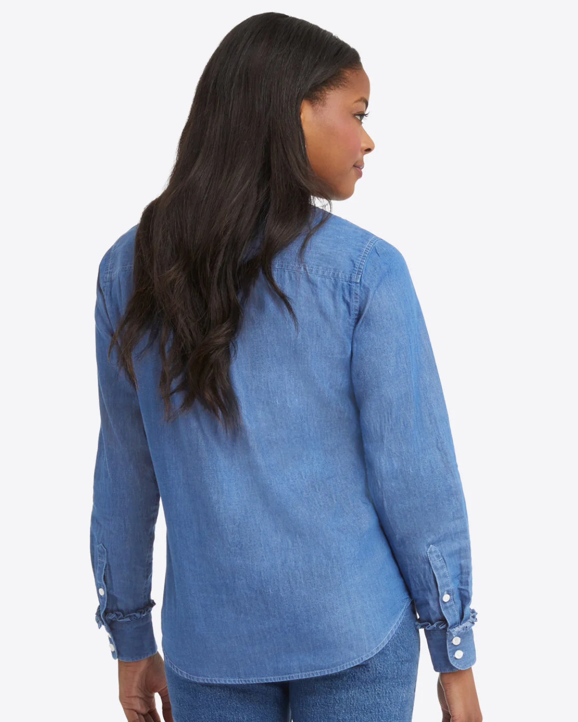 Anything But Basic. Our Button Town top in Denim Chambray is an iconic wardrobe staple that works with everything in your closet. A personal Reese favorite, it’s got a hint of Southern charm and its laidback style pairs with everything from a white jean to your favorite cargo pant. For a denim tuxedo moment, tuck it into your favorite blue jean and top it off with a killer boot.