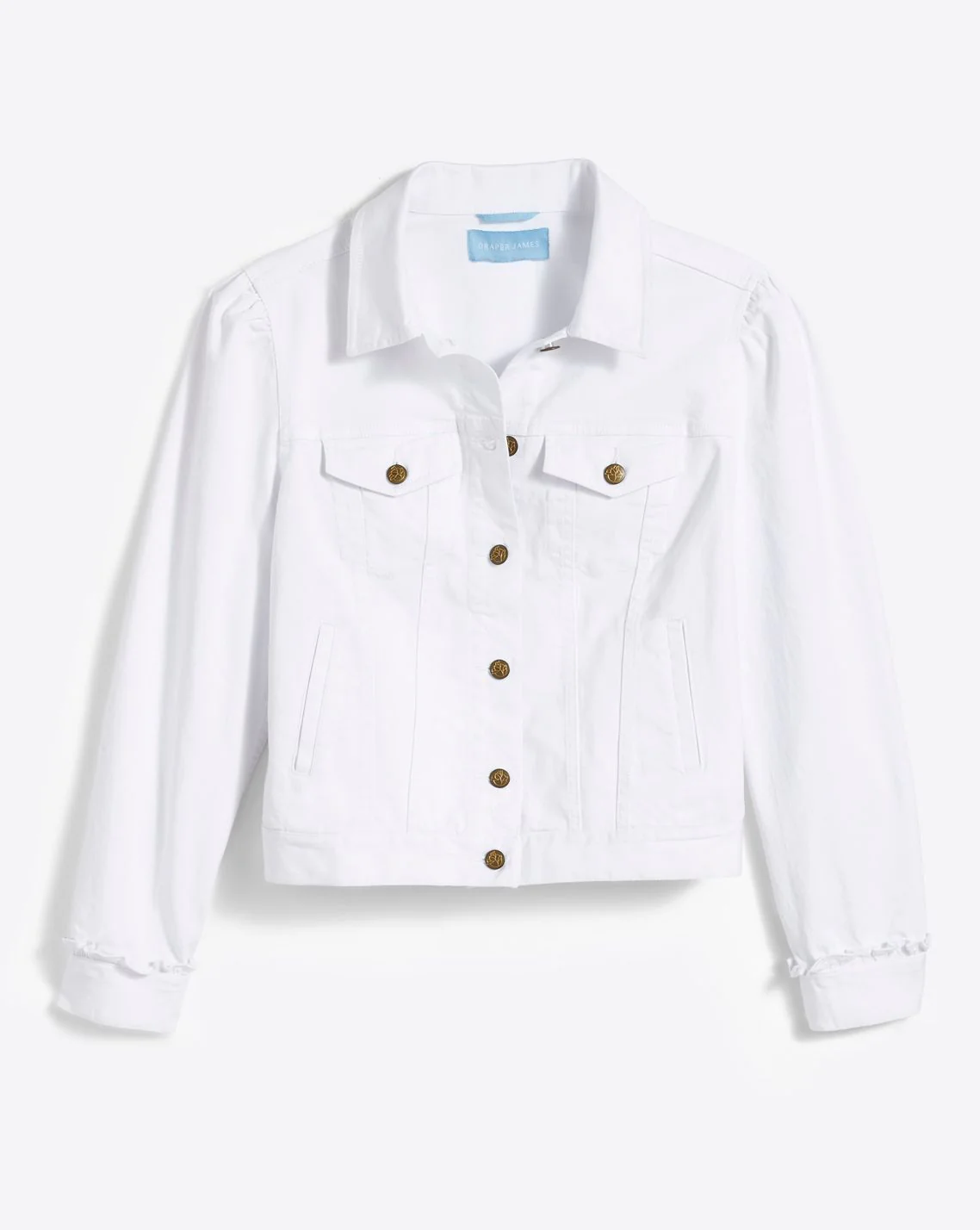This white denim jacket is the perfect spring staple piece. Featuring a light puff sleeve this denim jacket is a classic and will be great to throw over a dress, top, or to pair with our white flare jeans!